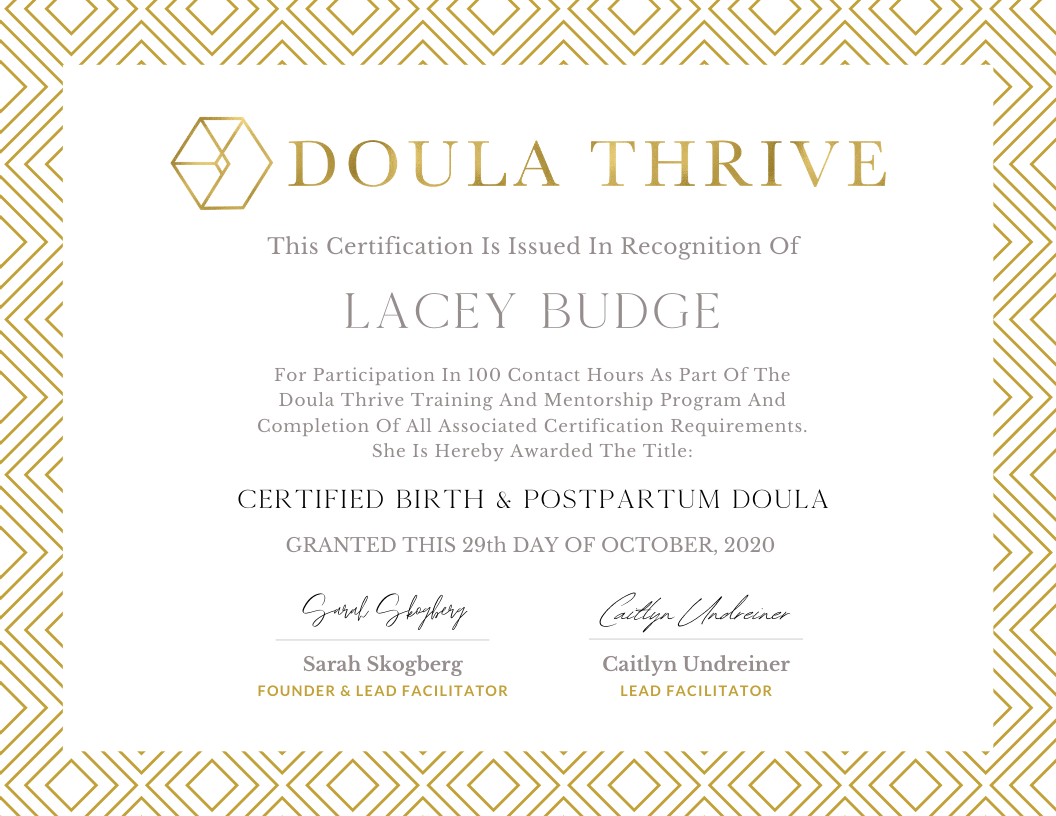 “Throughout my whole pregnancy and even while in labor, I had an overwhelming sense of calm and trust and I do believe Lacey played an important role in cultivating that with all the tools, support, and information she was continuously providing to help us prepare and go into our birth experience and postpartum with more confidence. You can tell Lacey really loves her work and puts so much love and thought into every moment she spends with her clients. I feel truly blessed to have had the opportunity to receive her Doula support and can’t recommend her services enough. Thank you Lacey!” ~Kelly V. (Complete Birth & Postpartum support)