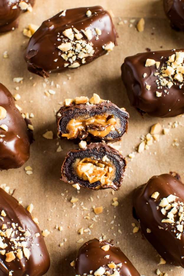 Fold the dates back together and do your best to press the peanuts and peanut butter inside.